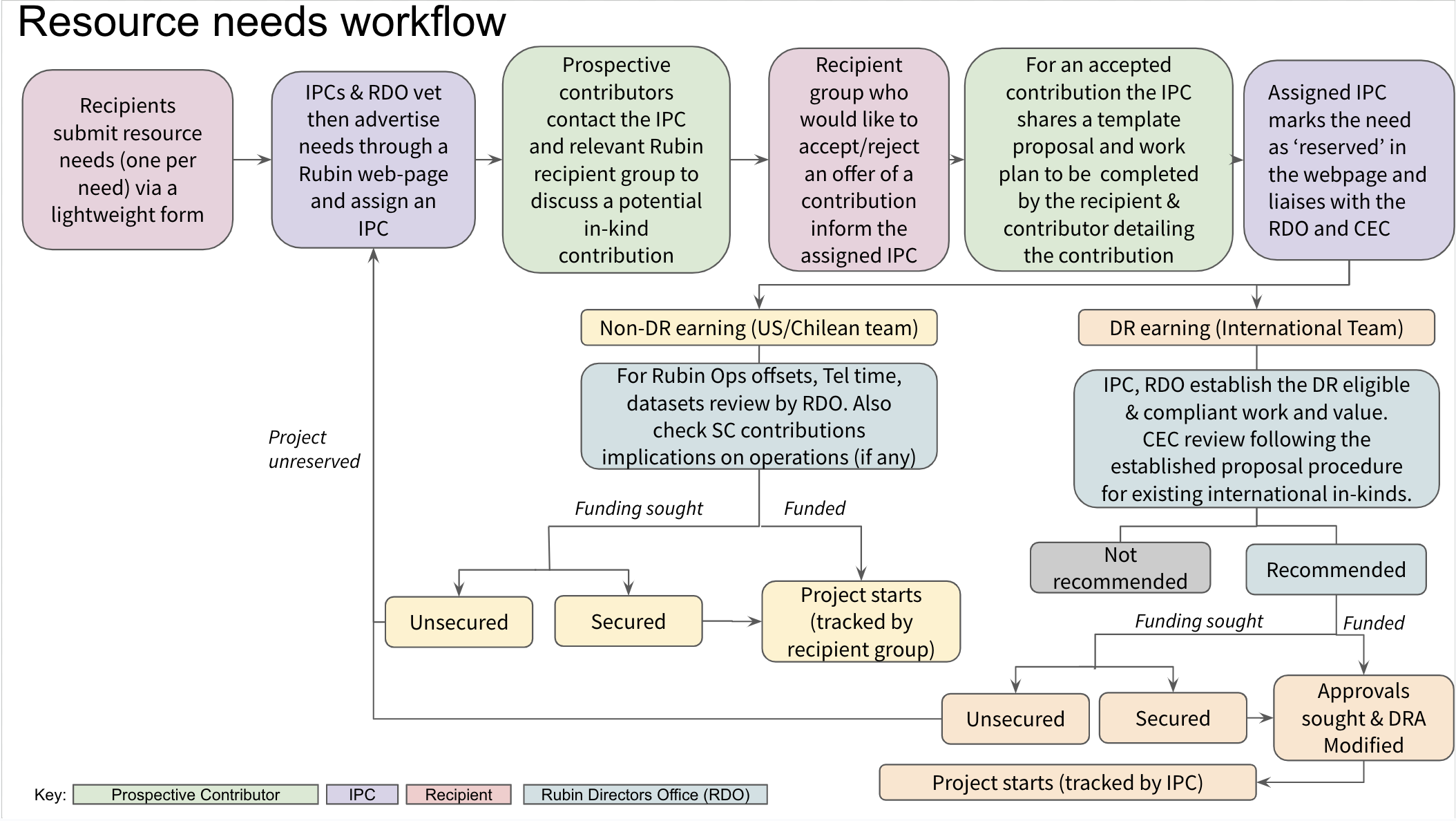 Once the Recipient group has decided whose offer they would like to accept, they should inform the assigned IPC. The IPC will provide the selected and recipient group with a form to describe the nature of the contribution and the amount of resource committed summarizing their discussions with the recipient group. The contribution will be evaluated by the Rubin Director’s Office (RDO) and the Contribution Evaluation Committee with the RDO determining the in-kind value of the work and verifying compliance with the guidance in the Handbook for In-kind Contributions.